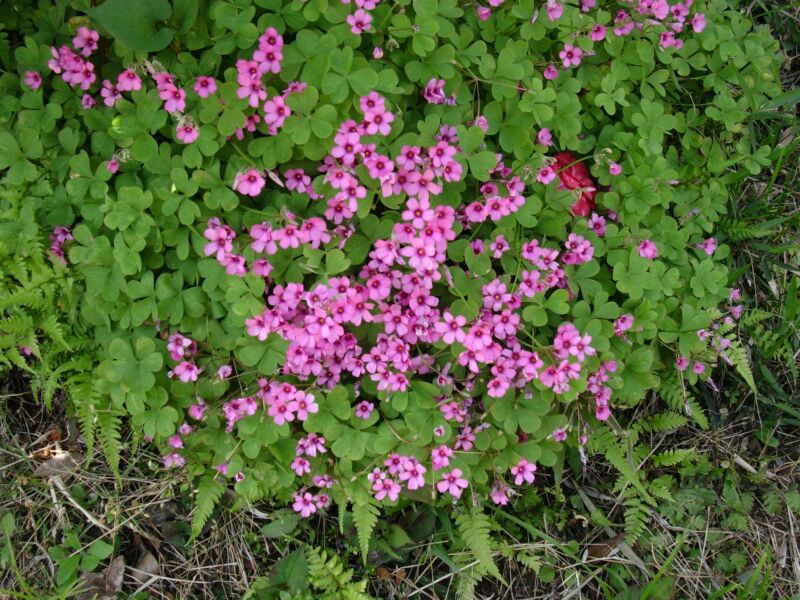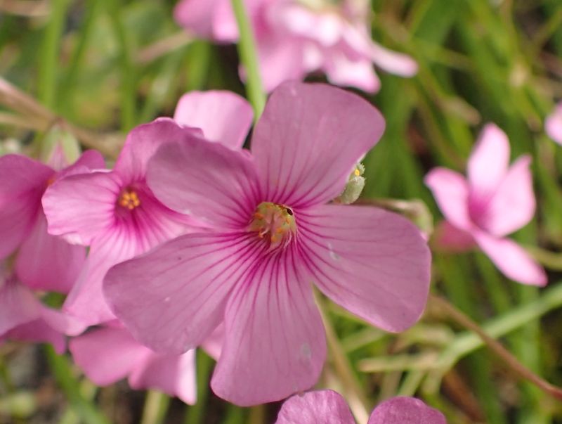 ムラサキカタバミ:花が紅紫色で葯が白い、地中に多数の鱗茎を作って散らばらせる。
