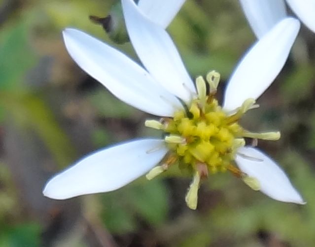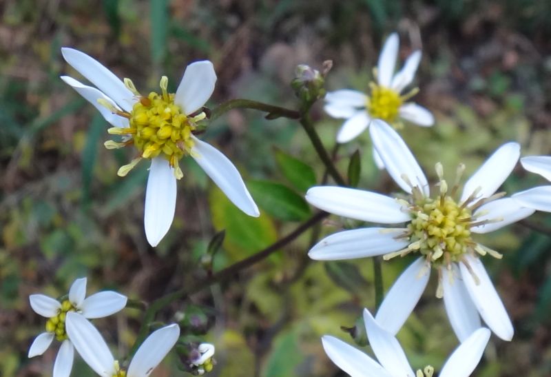 シラヤマギク:下葉は柄が長い心形、上葉は小さい被針形で、6〜8枚の白い舌状花が不等間隔に並び、筒状花は白っぽく、総苞片が3列に並ぶ。