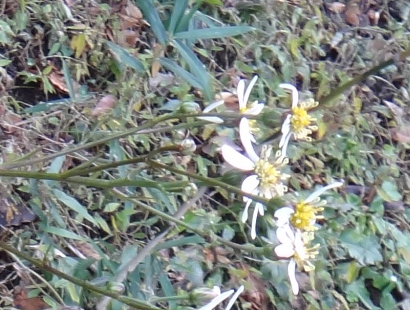 頭花は直径約2センチで、舌状花は白くて重なり合わず、筒状花は黄色い。