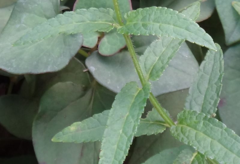 葉は披針形で対生し、葉脈がくぼむ。茎には刺し毛がある。(2015/7/2)