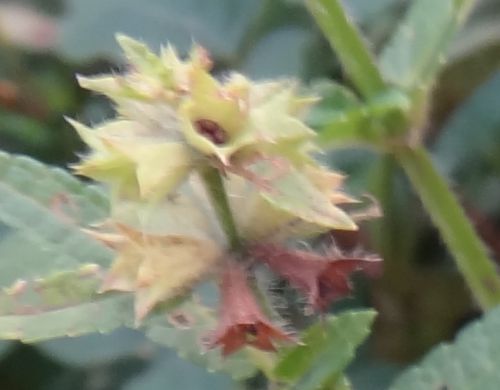 4本の雄しべがカタツムリの角(つの)のように立ち上がる。花後の萼内に4分果ができつつある。(2016/7/27)