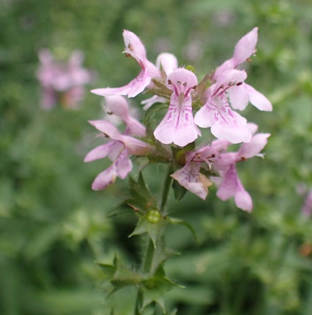 茎先の短い花穂に、長さ12〜15ミリの淡紅色の唇形の花が数段輪生する。
