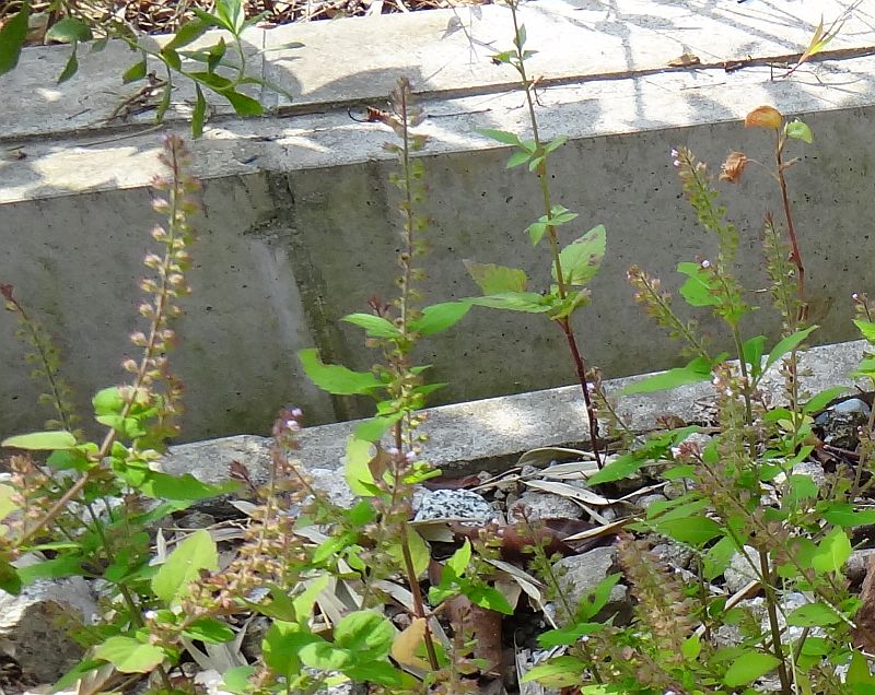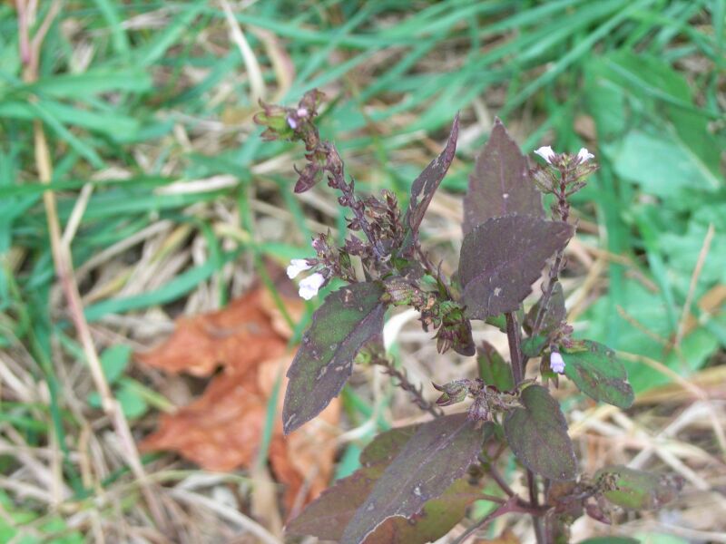 イヌコウジュ:秋に咲く、全体に細毛、葉は卵状長楕円形、浅い鋸歯片側に6〜13個、上萼片の裂片は鋭くとがる、香りは少ない、花穂直下の葉は広卵形。