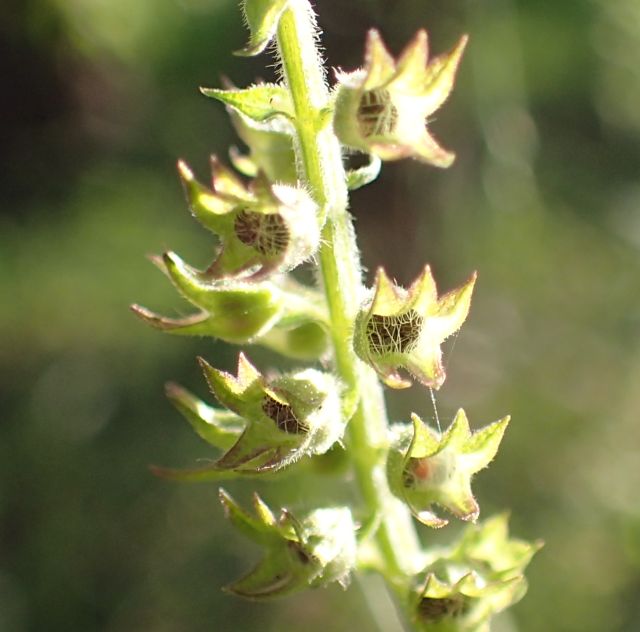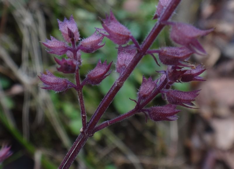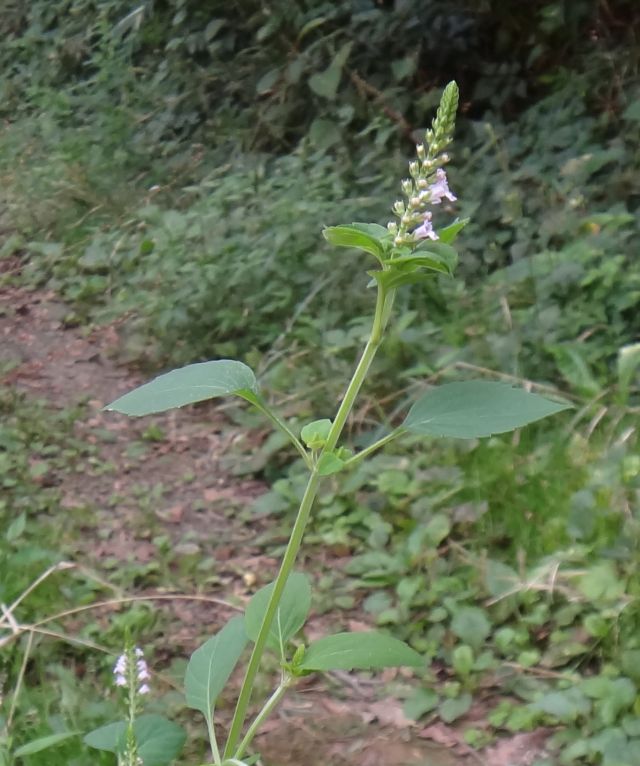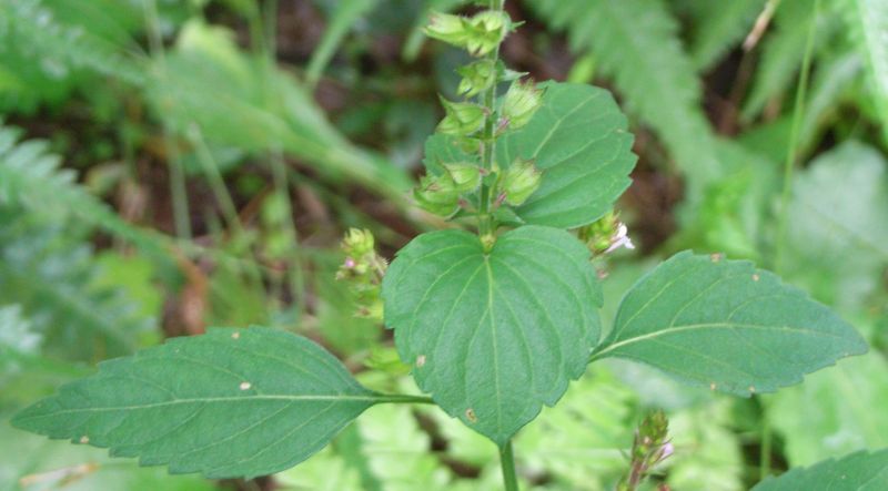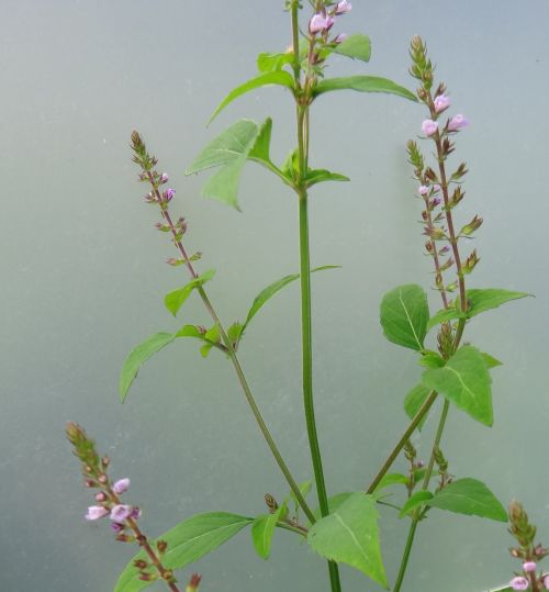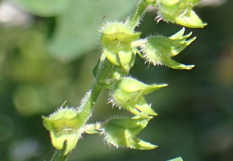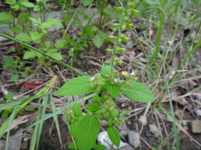 ミゾコウジュ:初夏に咲く、茎の稜に細毛、葉は長楕円形、鋸歯は浅い、上萼片の先は裂けない、花穂直下の葉は他の茎葉と同じ。