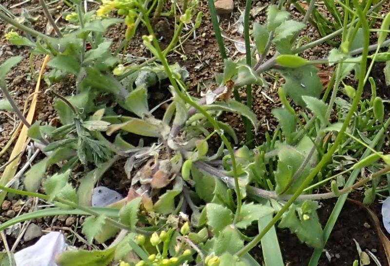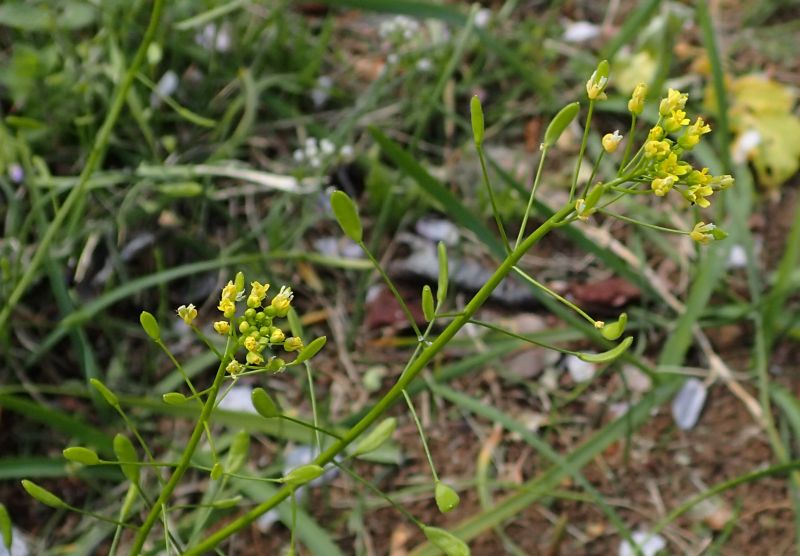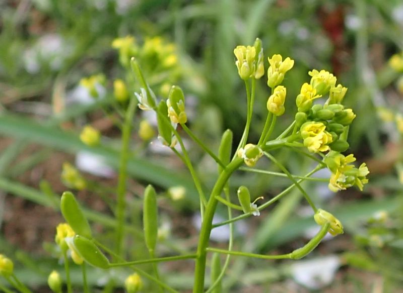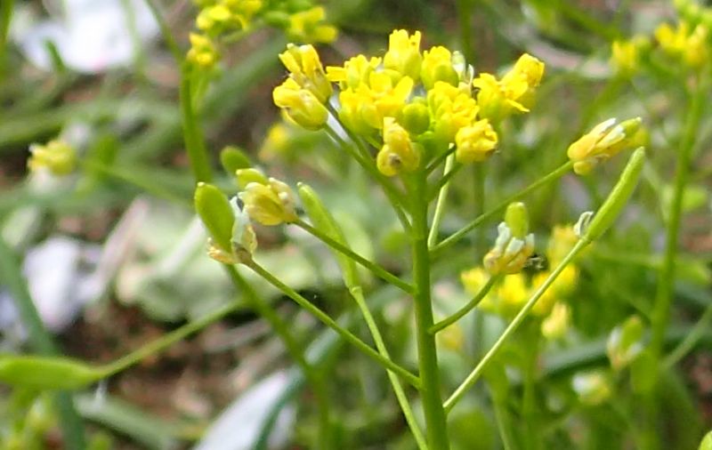 茎先に総状花序がつき、小さくて黄色い4弁花が咲く。