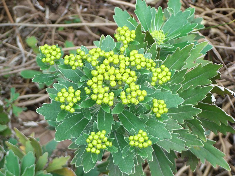 黄色い筒状花だけの頭花が円盤状にならぶ。