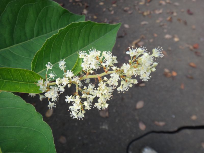 雌雄異株で、夏に葉腋から出る複総状花序に、