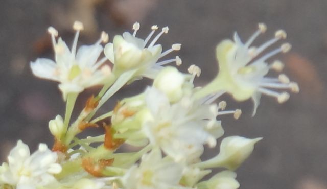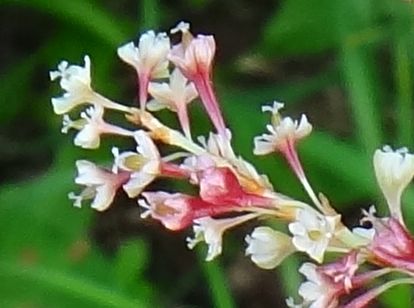 白か赤みを帯びた小さな花を多数つける。花冠は5裂する。