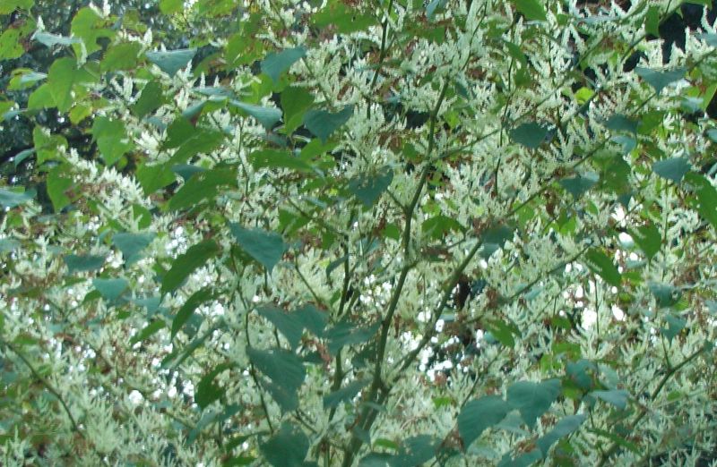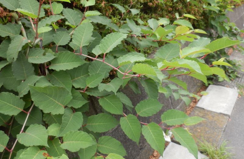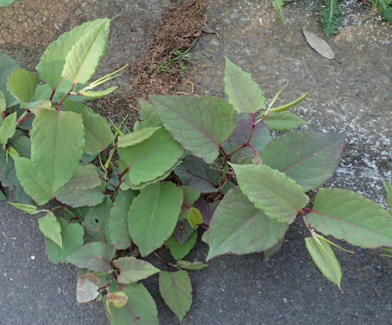 イタドリ:葉の基部が矢じり形で、葉裏が粉白色を帯び、1つの枝の各葉腋から花穂がのび、花色は白に近い。
