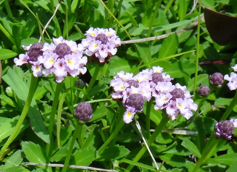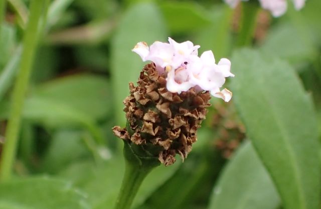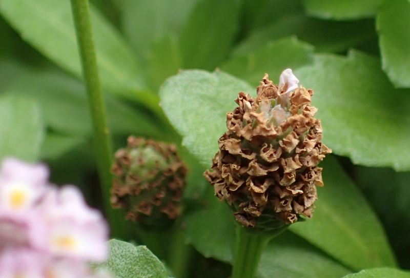 蕾は赤紫色の苞で覆われ、頭状に集まっている。苞の間から花がのぞいて咲き始める(右下)。(2015/6/7)