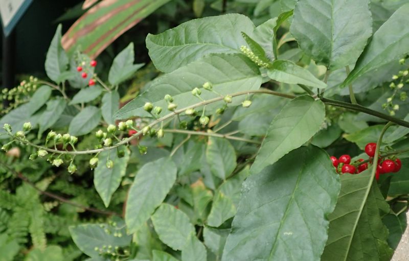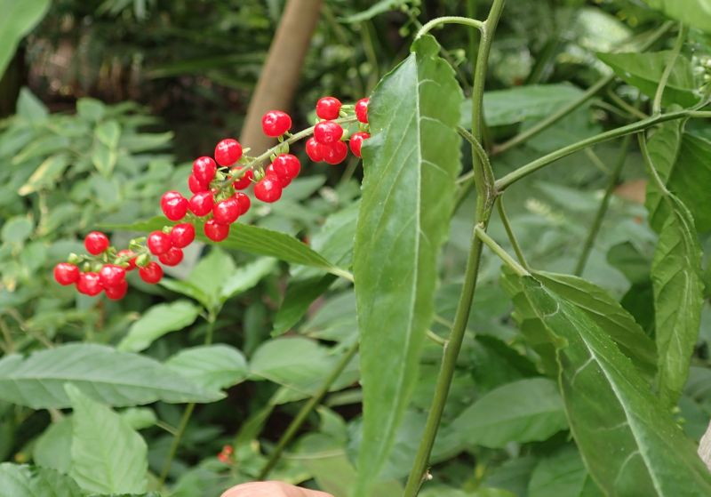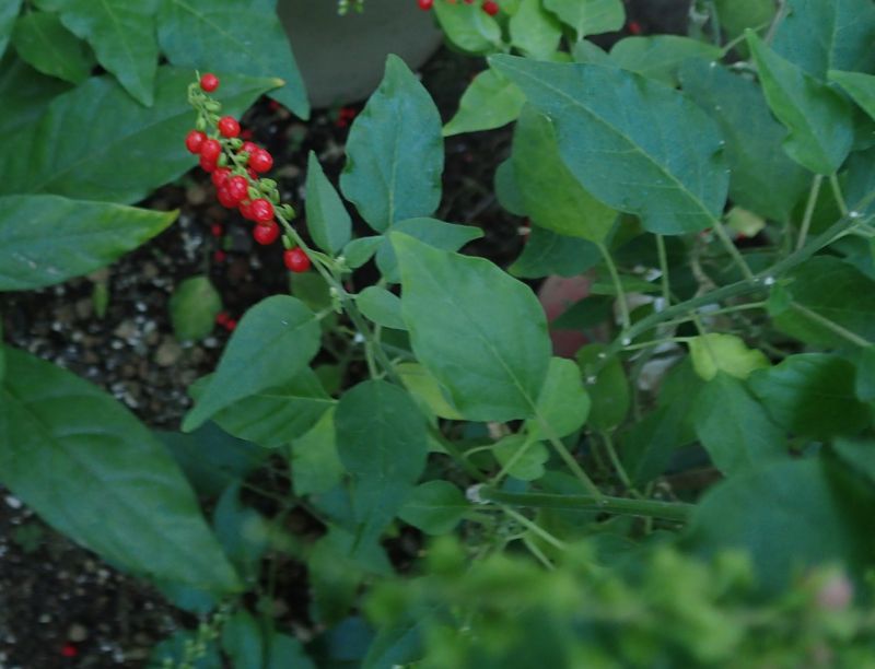 赤い液果が長期間ついている。萼片は緑色となって反り返っている。