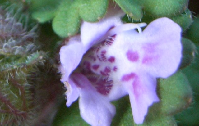 淡紫色の唇形花は、濃紫色の斑紋と白い毛をもつ中央裂片が前に突き出す。