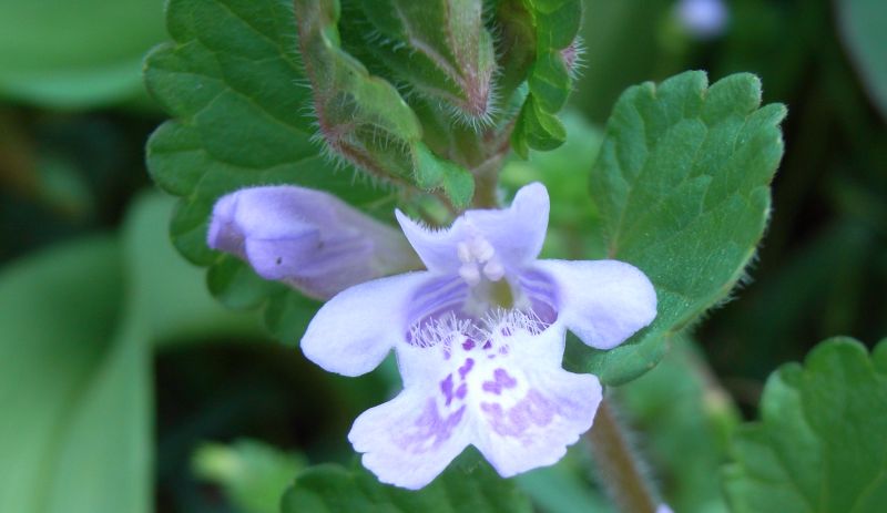 葉腋に長さ1.5〜2.5センチの淡紫色の唇形の花を1〜3個つける。