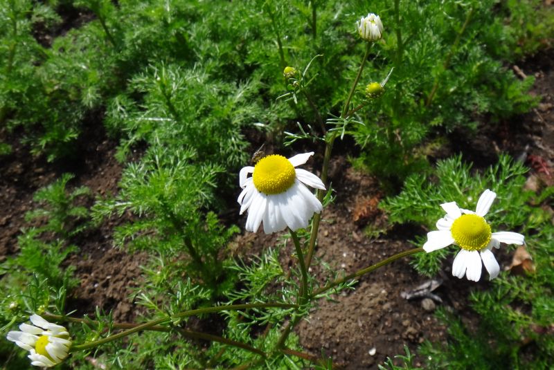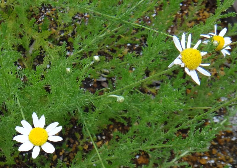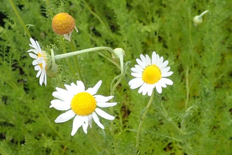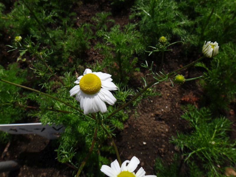 ローマン・カモミール :多年草、筒状花部分の盛り上がりが少ない、葉や茎にも香りがある。