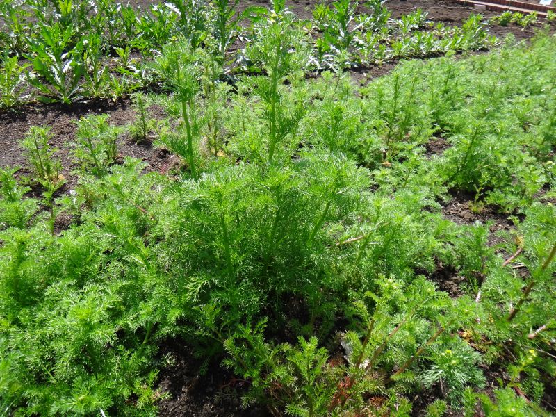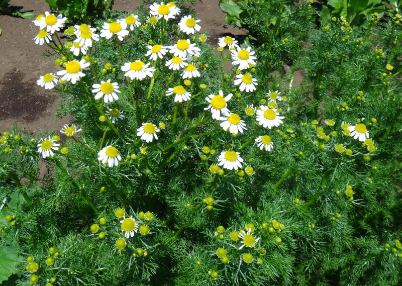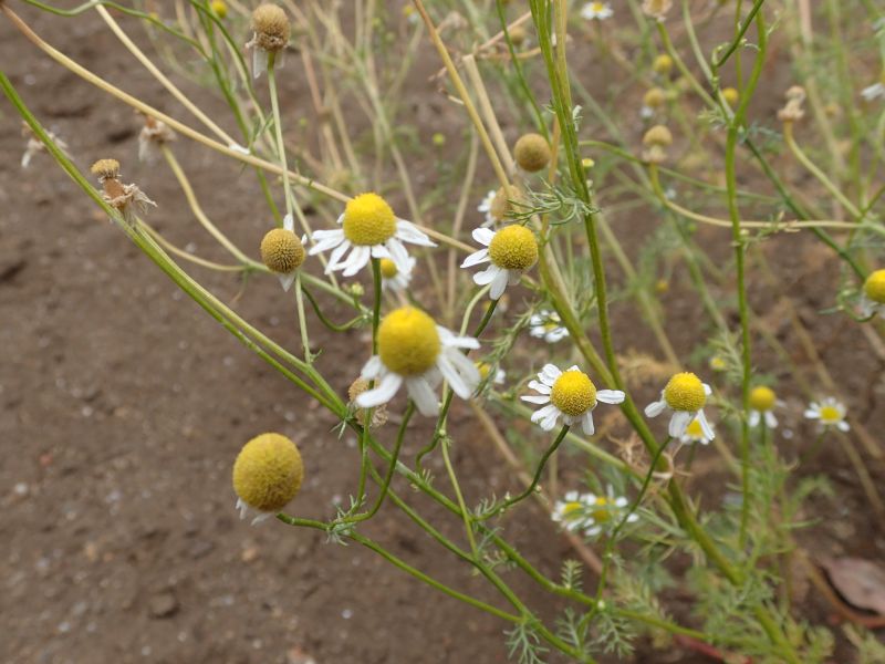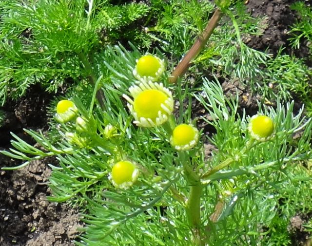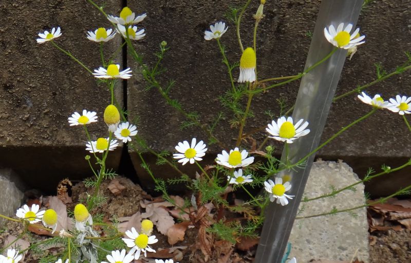 ジャーマン・カモミール:1年草、筒状花部分の盛り上がりが大きい、香りがあるのは花。