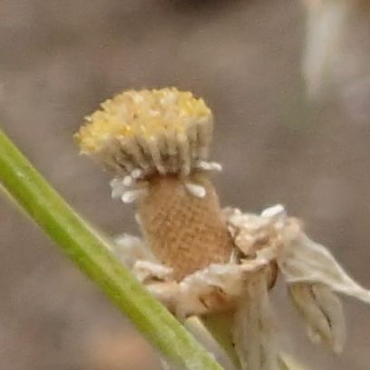 シカギク属、舌状花と筒状花をもつ。秋蒔き1年草。