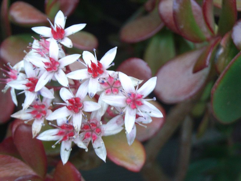 冬、枝先の散形花序に花弁が白くて中心部の赤い星形の5弁花をつけるが、
