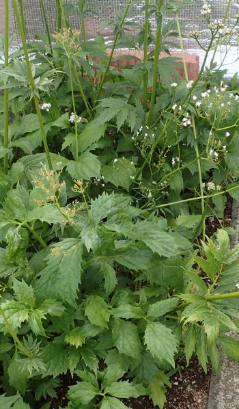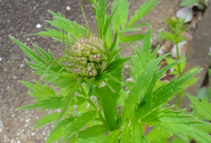 下部では奇数羽状複葉が対生し、小葉には粗い鋸歯がある。(2015/5/6)