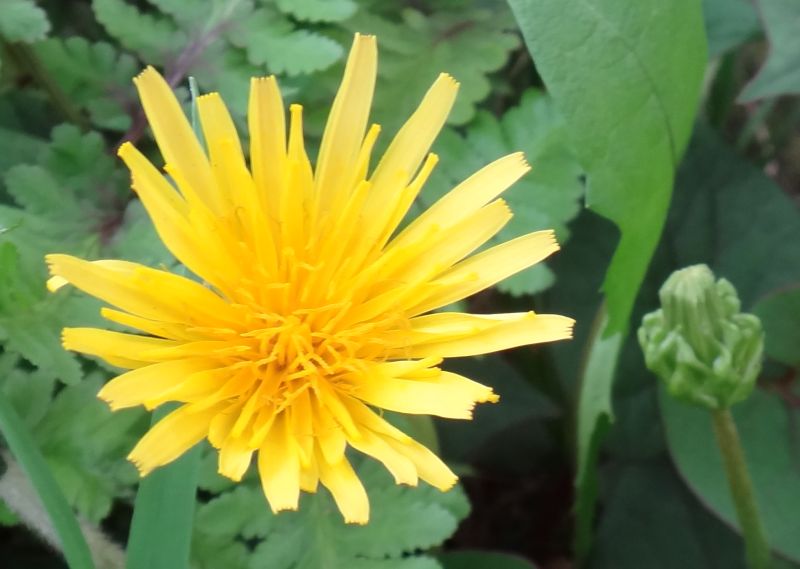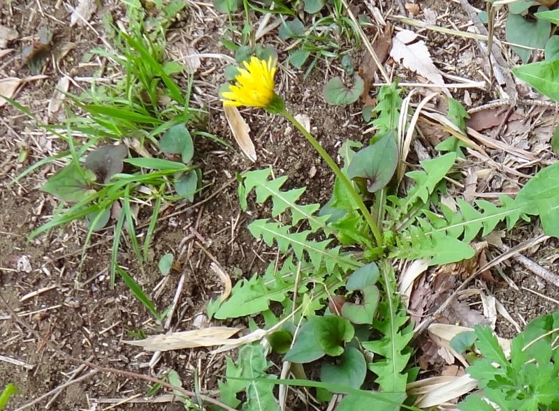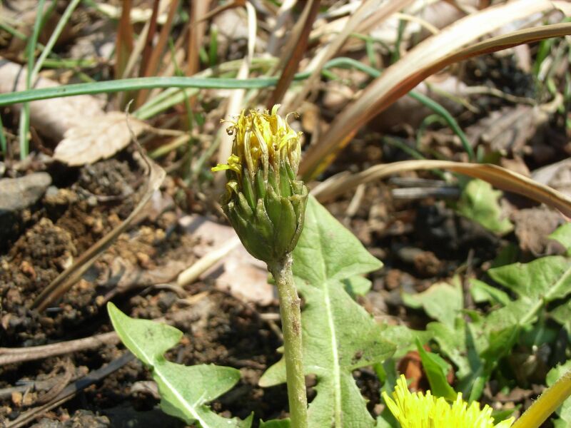 カントウタンポポ:総苞外片は直立し、頭花は直径3.5〜4センチと大きい。