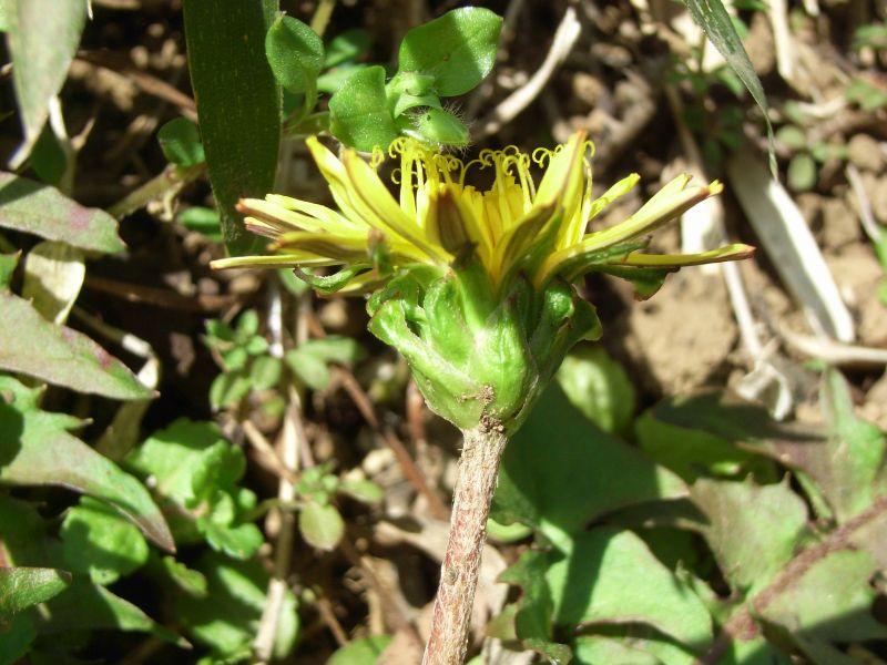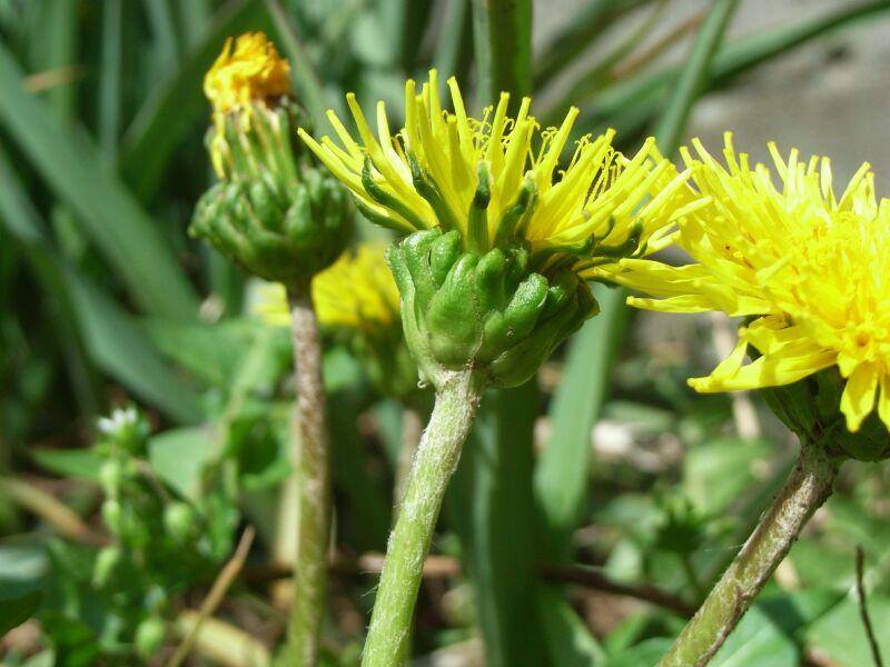 カンサイタンポポ:総苞外片は直立し、頭花は直径2〜3センチと小さい。