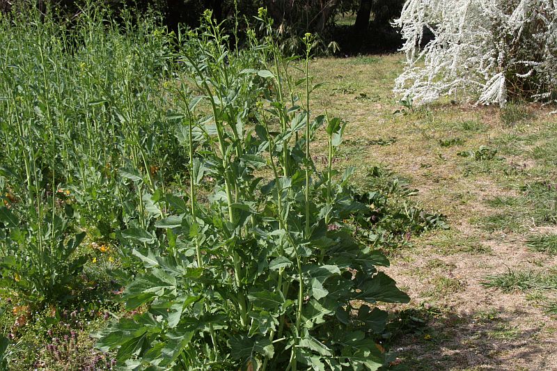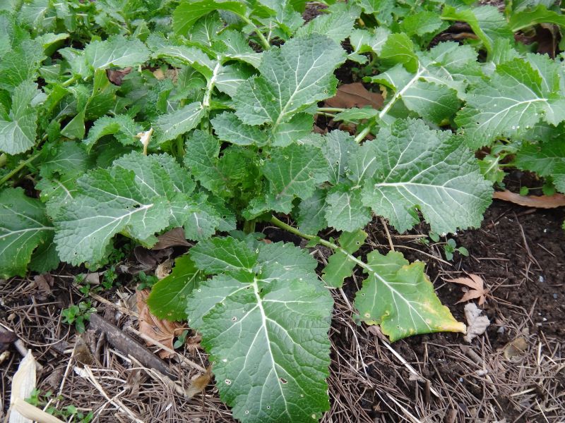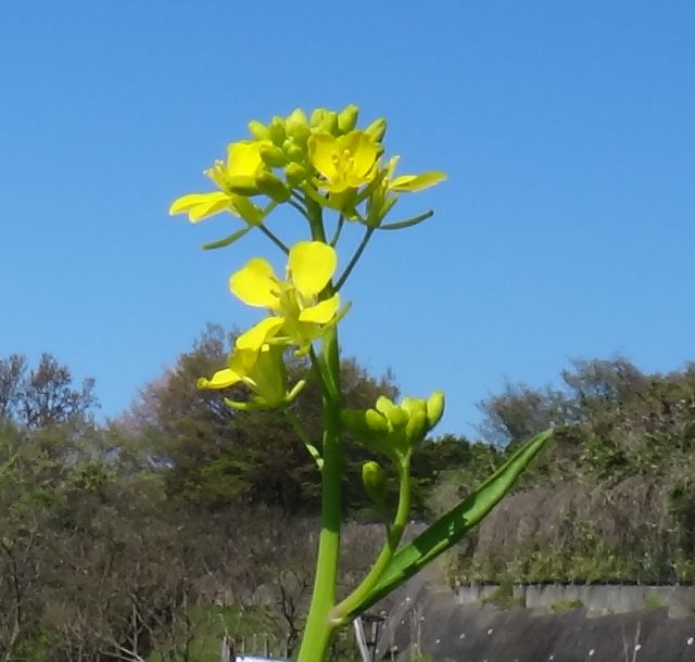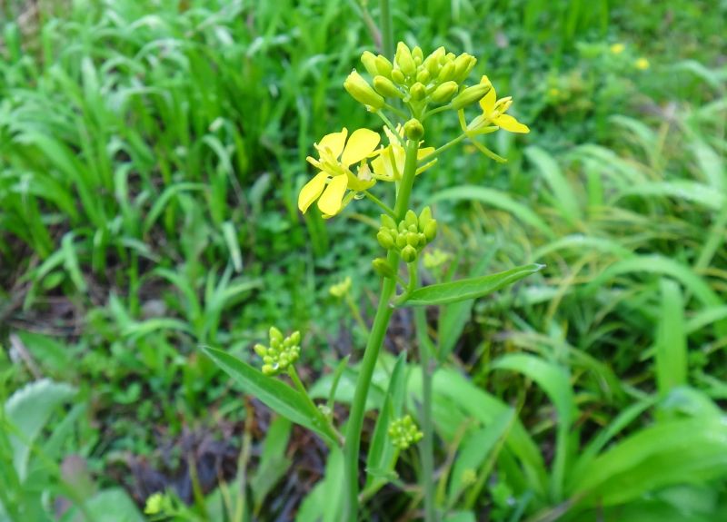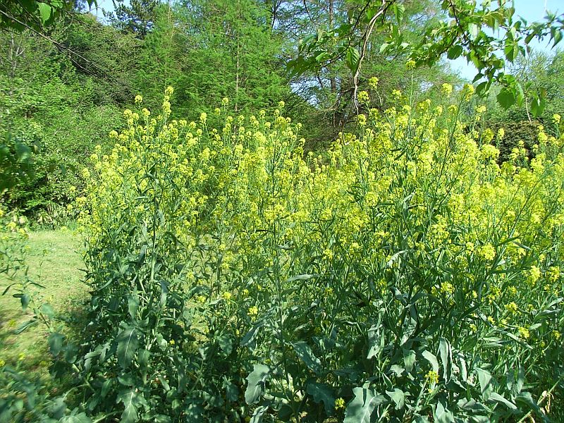 カラシナ :葉は茎を抱かず、鋸歯があり、花は小さく、種子は黄褐色。