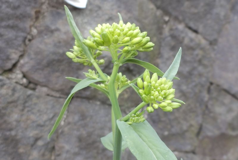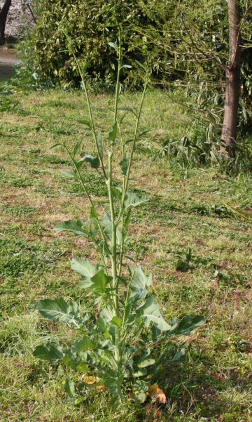 クロガラシ :2メートル以上にのび、葉は茎を抱かず、鋸歯があり、花は小さく、種子は赤褐色。