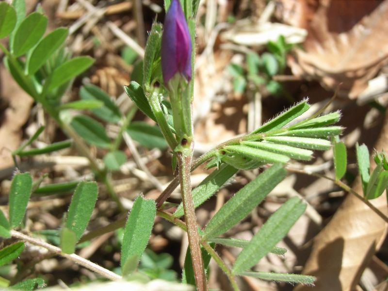 春に葉腋に1〜3個の紅紫色の蝶形花がつく。