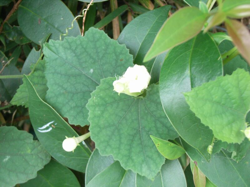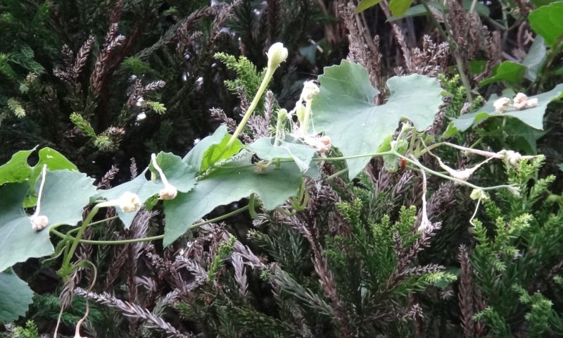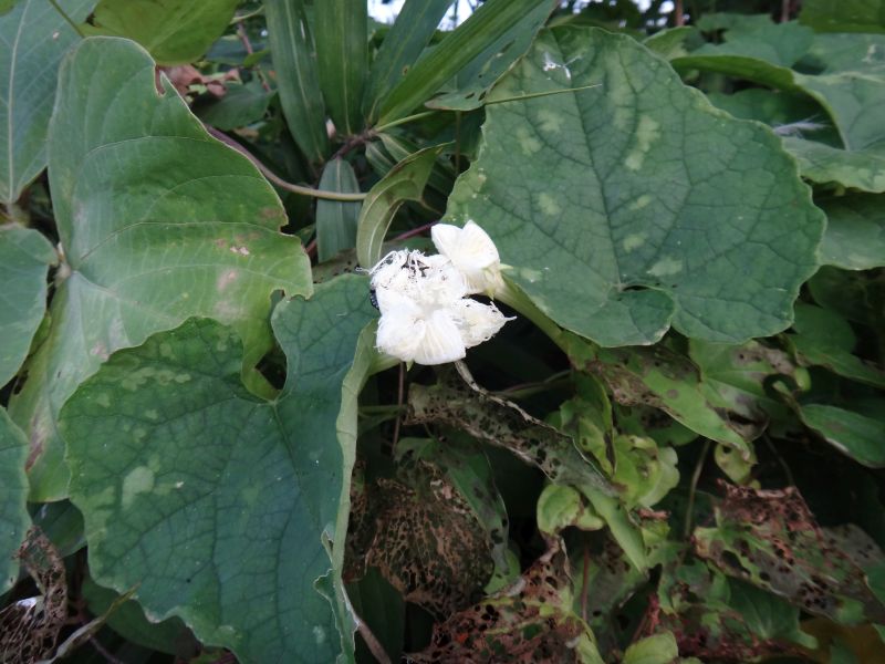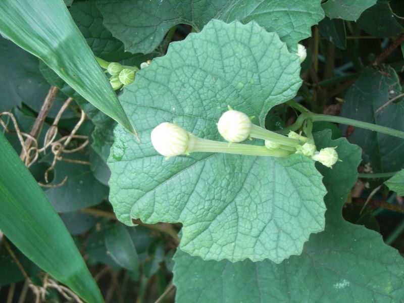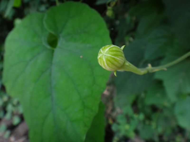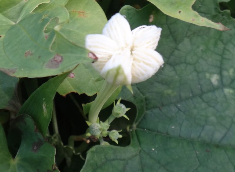 近縁のオオカラスウリ。蕾が大きく、葉がヤツデのように深く裂ける。(2015/7/2)