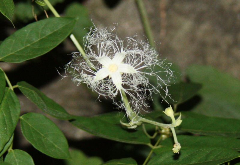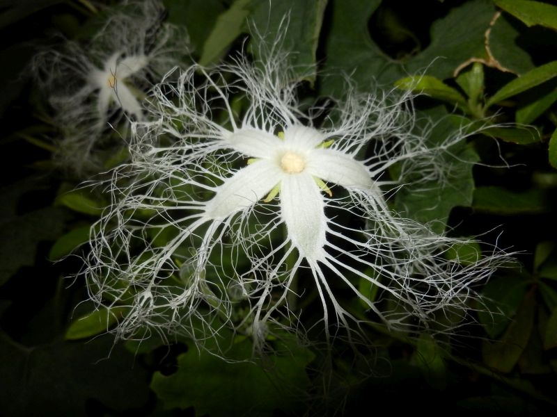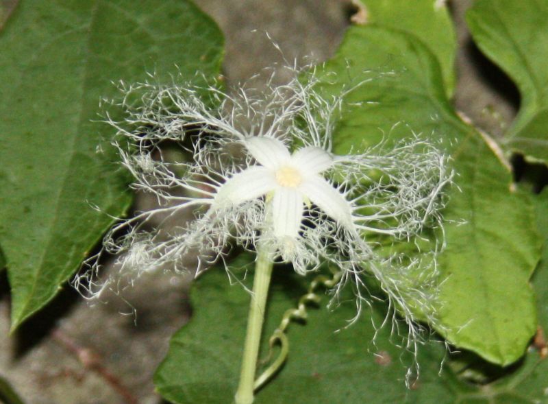 葉腋に白色花を1個つけ、花冠は5裂してさらに糸状に裂ける。