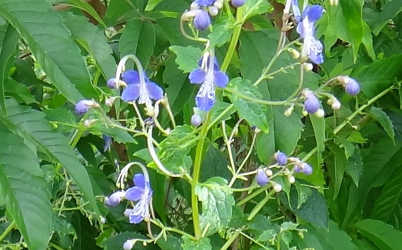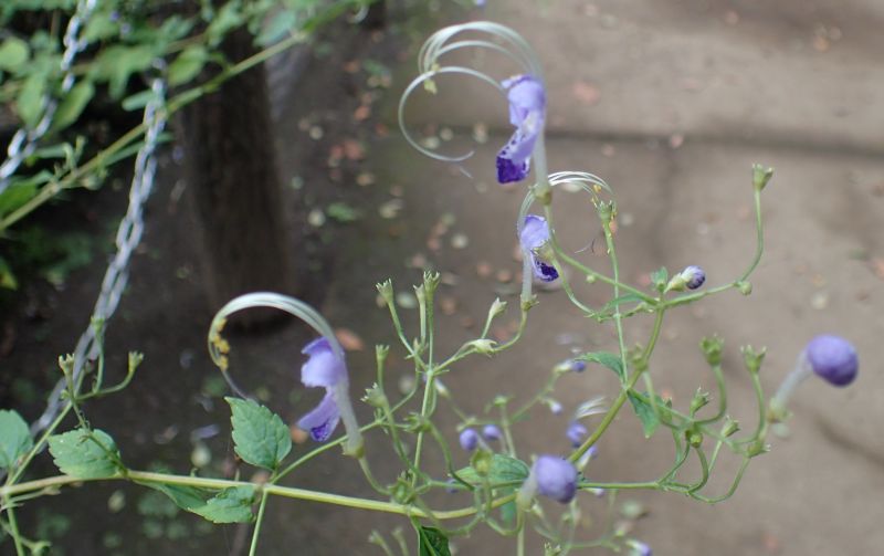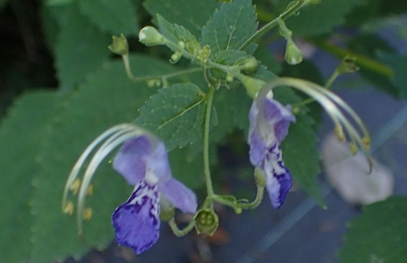 葉腋から出る集散花序に、淡青紫色で花冠の5裂した花をつける。
