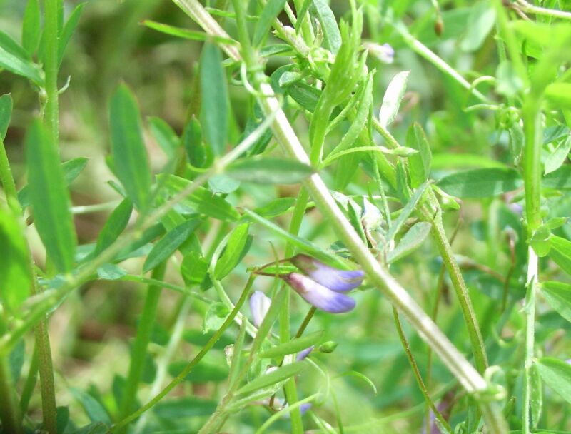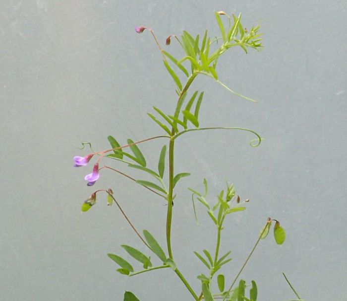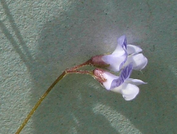 2つ(あるいは1〜3個)の淡青紫色の小さい蝶形花が少し離れあってつく。