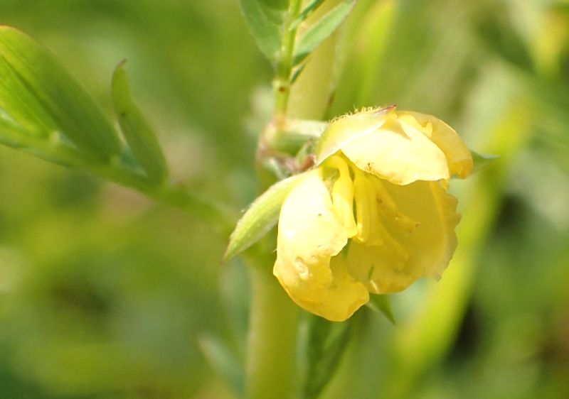 葉腋に直径約7ミリの小さくて黄色い5弁花が1つずつ咲く。