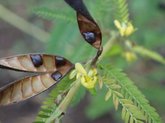豆果は長さ3〜4センチで、扁平で細毛があり、黒褐色に熟す。