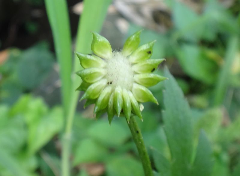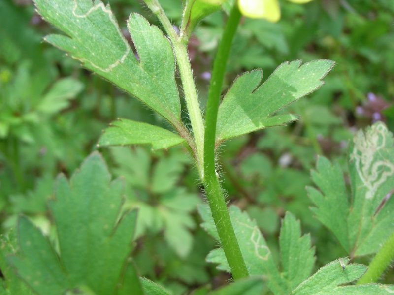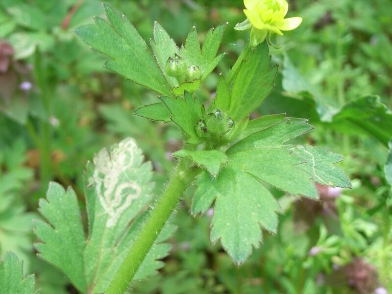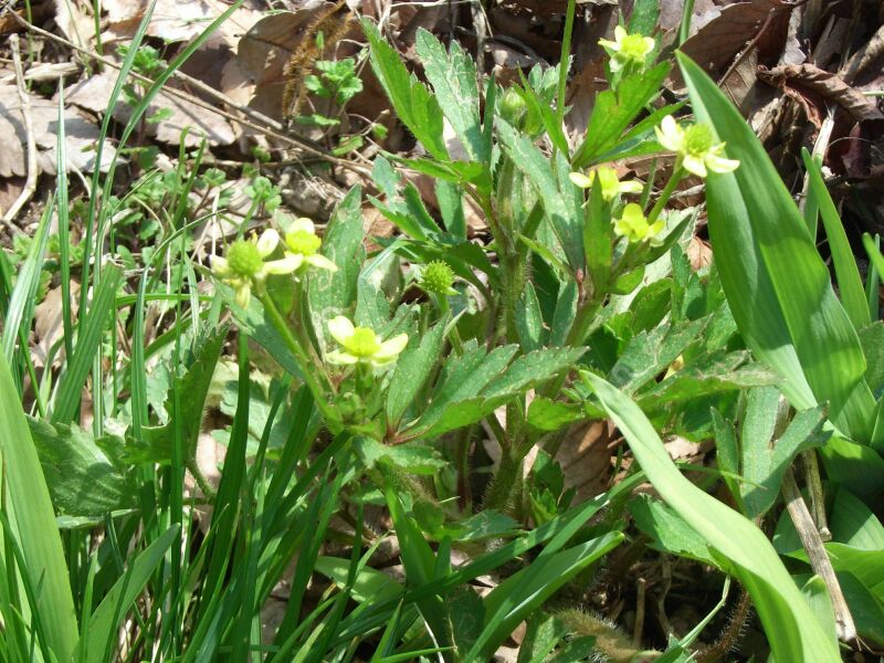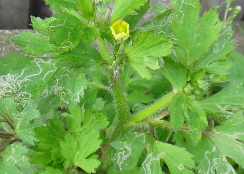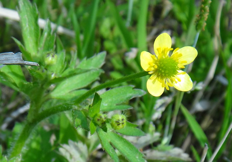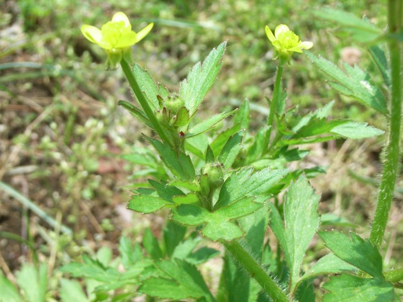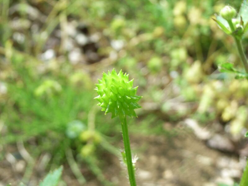 ケキツネノボタン:そう果の先が巻かず、茎に毛があり、小葉の切れこみが深く、鋸歯がとがる。