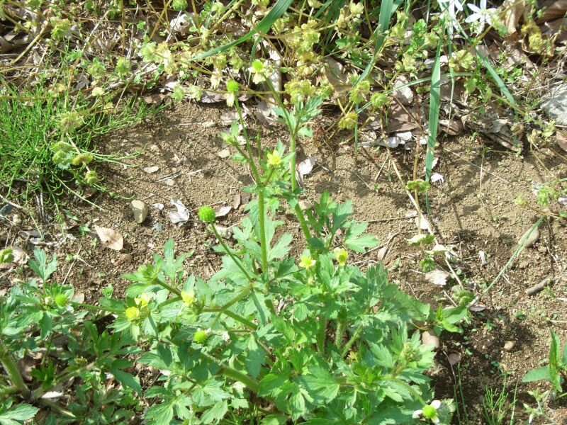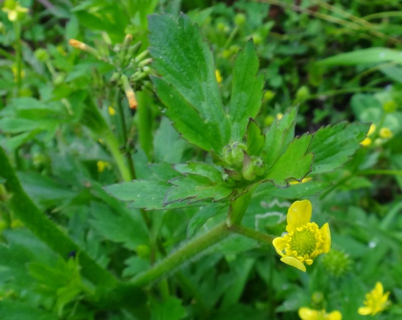 キツネノボタン :そう果の先が巻き、茎は無毛で、小葉の切れこみが浅く、鋸歯はとがらない。
