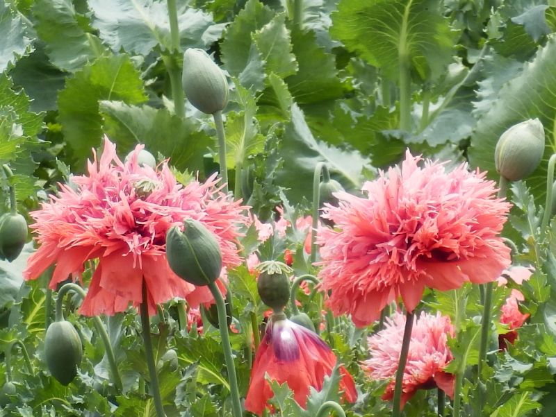 ケシ :葉は長楕円形、葉柄なし、無毛で全体に粉白色を帯びる。