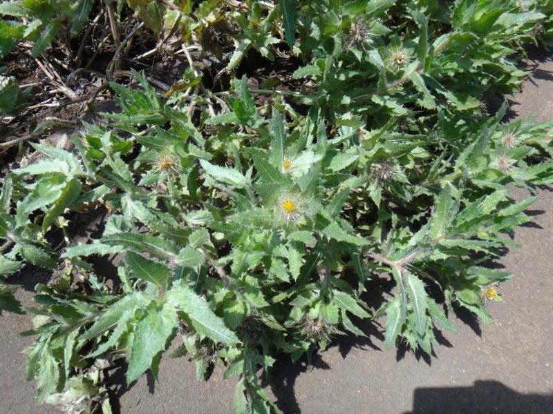 黄色い筒状花からなる頭花の下に棘状総苞片が放射状に出る。