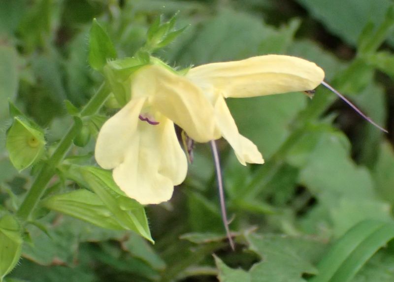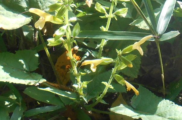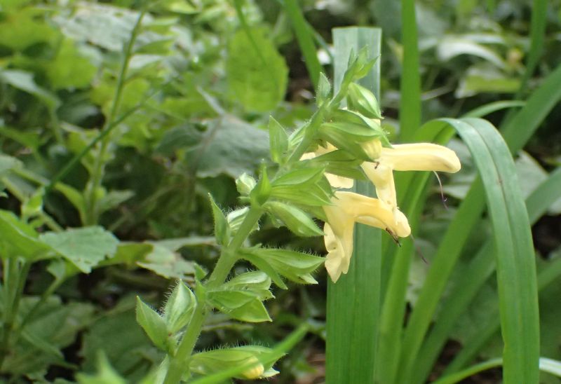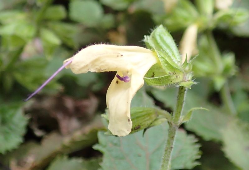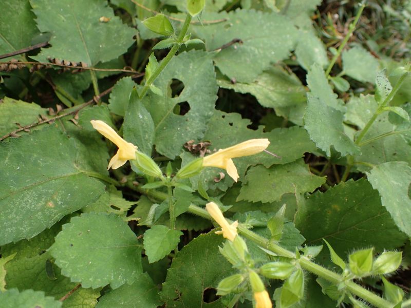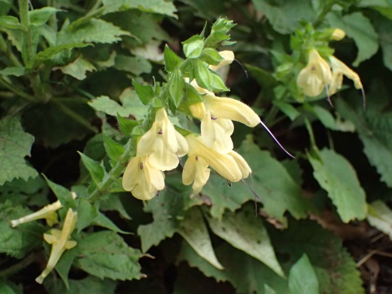 長さ2.5〜3.5センチの黄色い唇形花を数段横向きにつける。