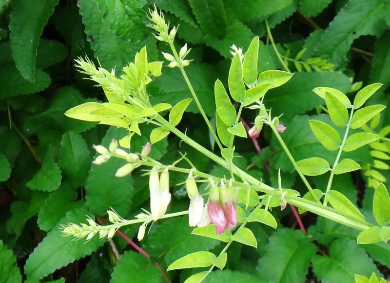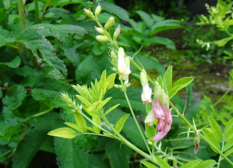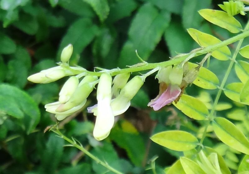 夏に葉腋から出る総状花序に淡黄白色の蝶形花を咲かせる。