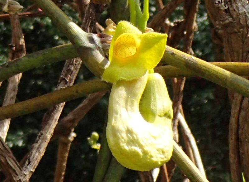 キダチウマノスズクサ:茎が木質化、葉は三角状卵形、花は黄色くて太い、刮ハは偏球形。