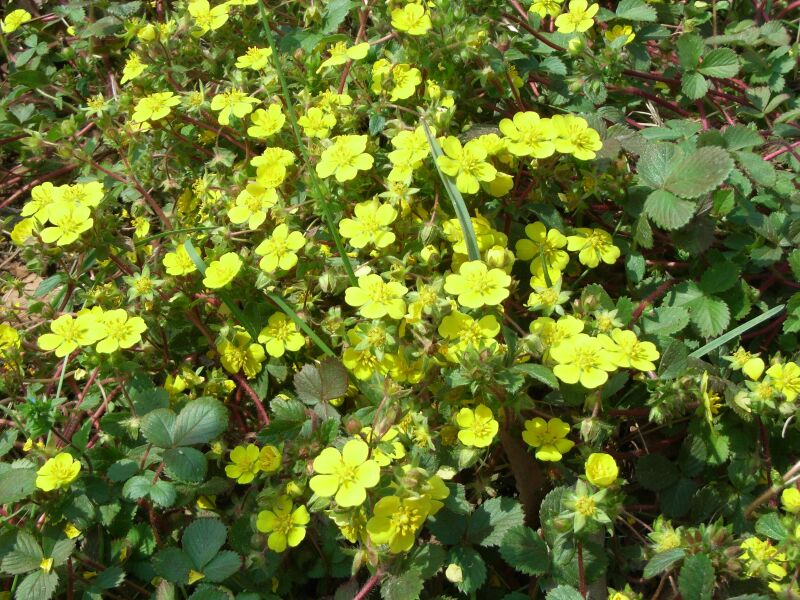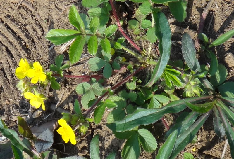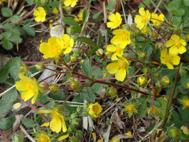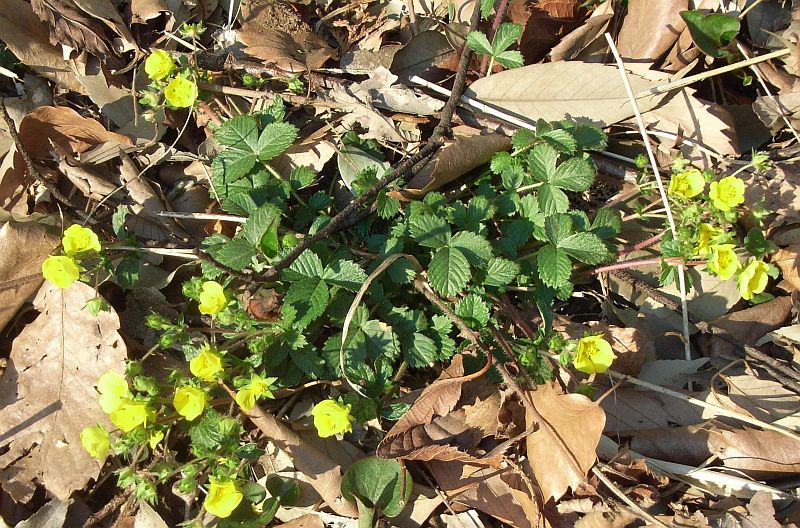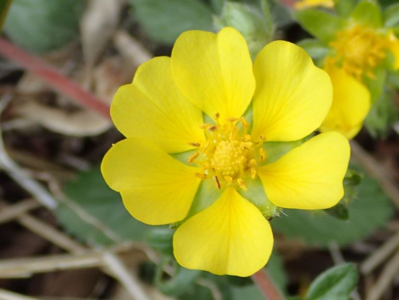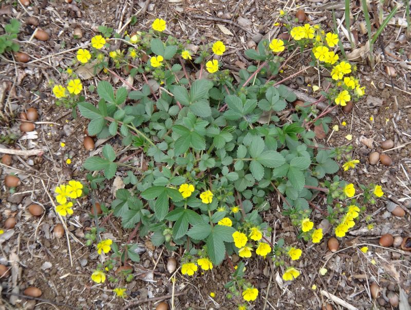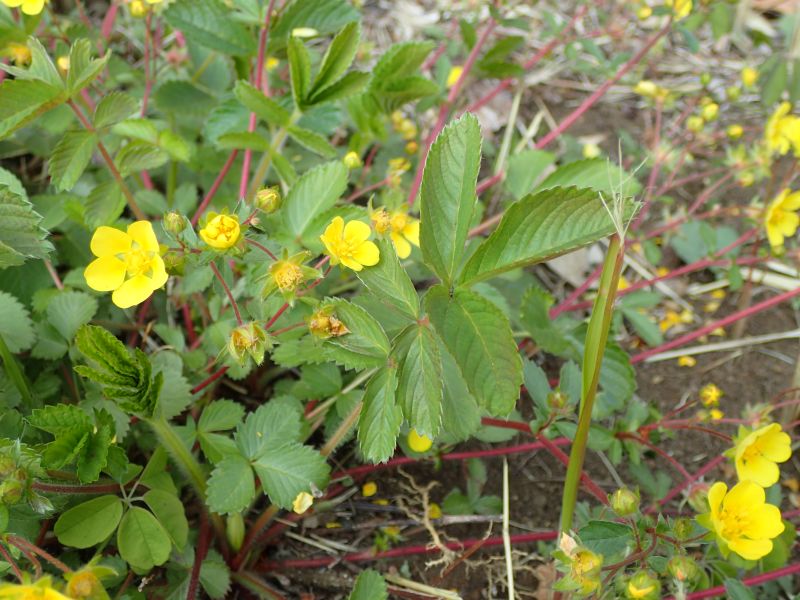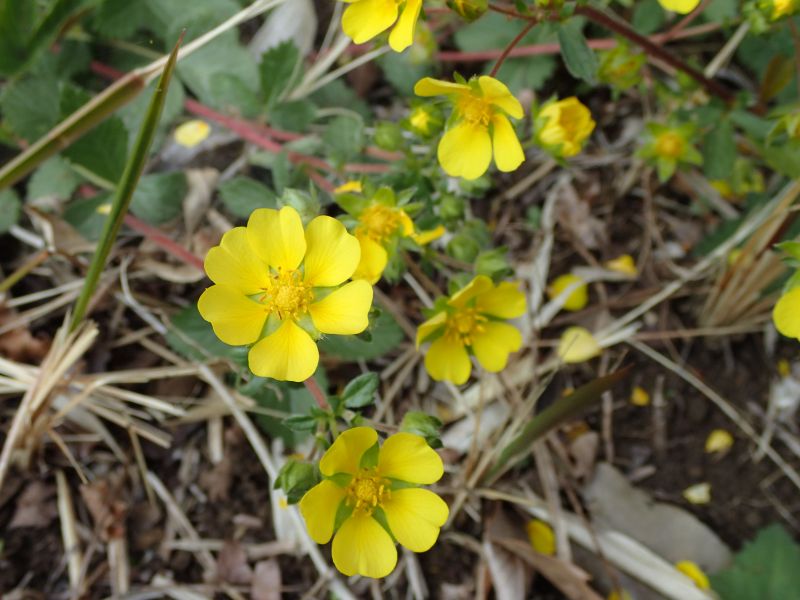 根元から出る集散状花序に、直径1〜1.5センチの黄色い5弁花が咲く。