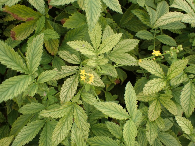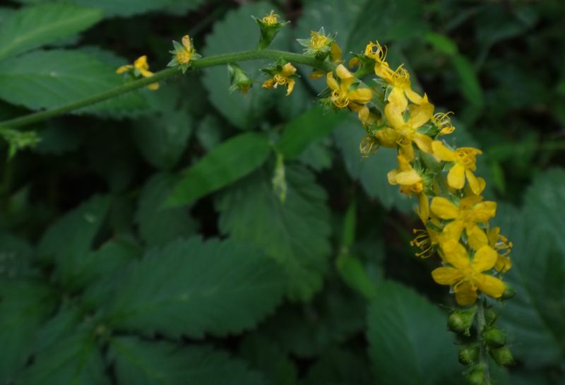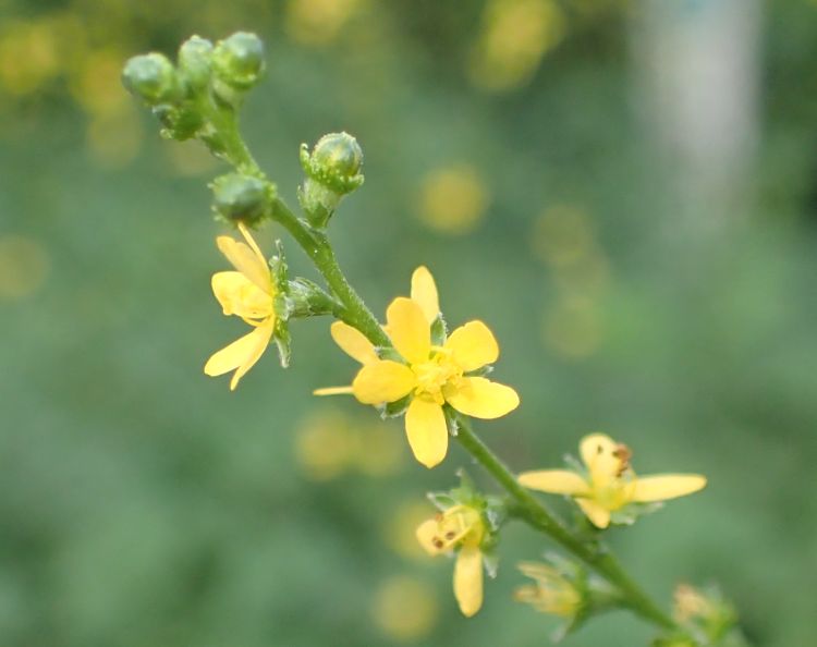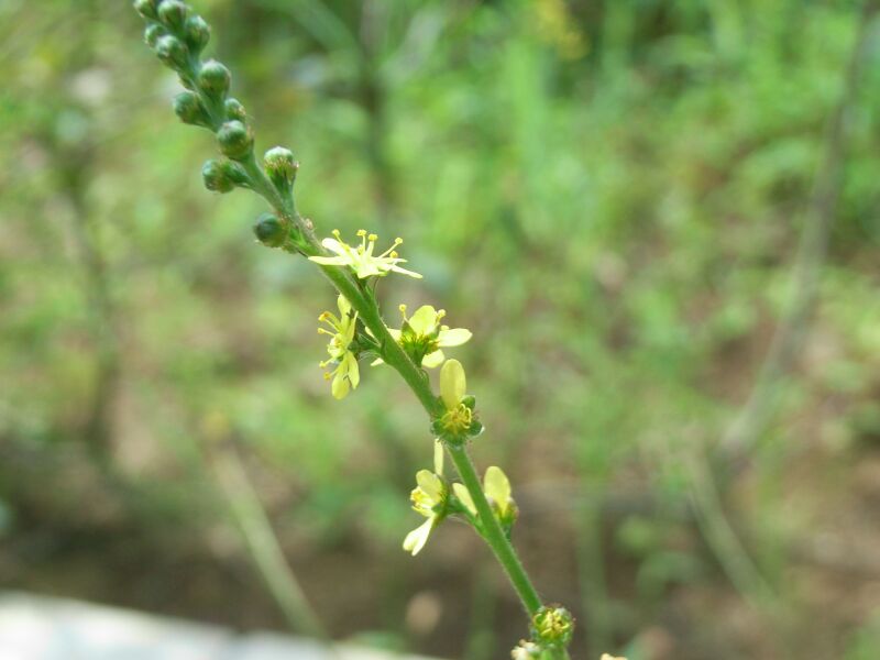 夏に枝先に総状花序を立ち上げ、直径6〜11ミリの5弁で黄色い花をつける。