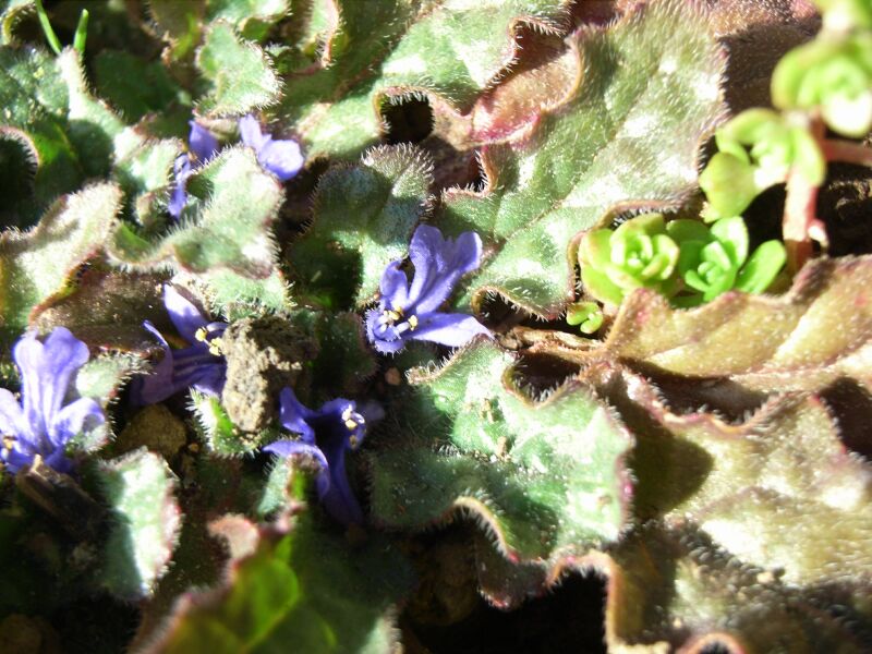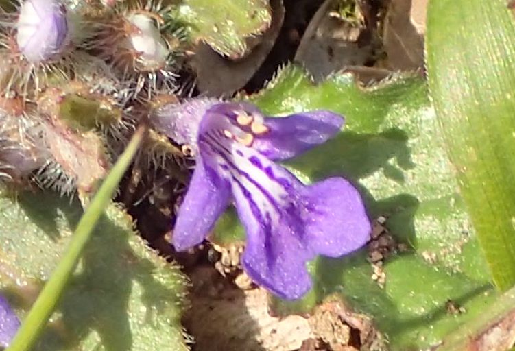 葉腋に約1センチの濃紫色の唇形の花を数個つける。