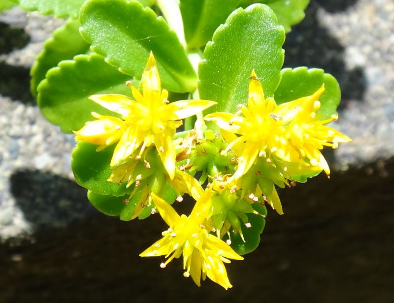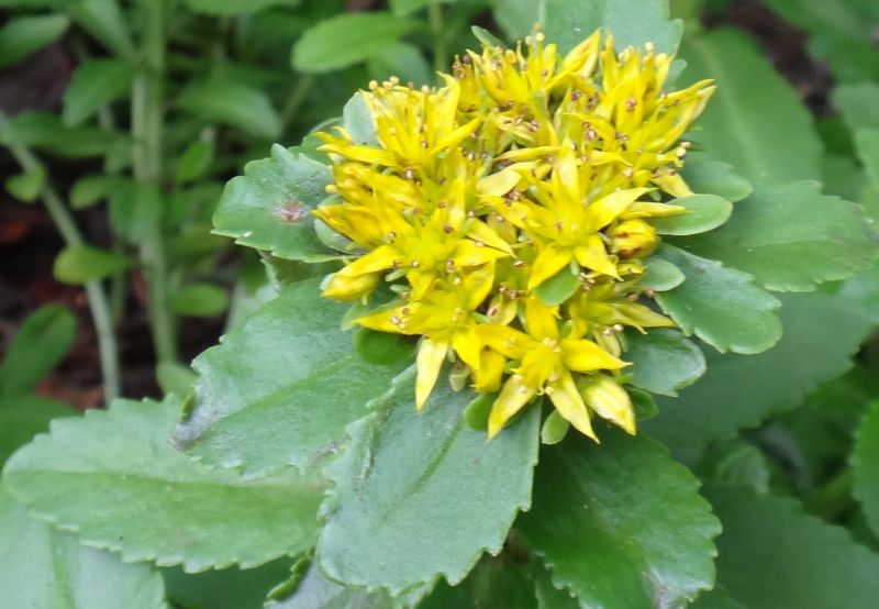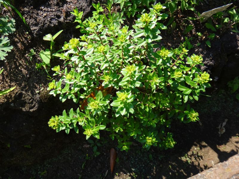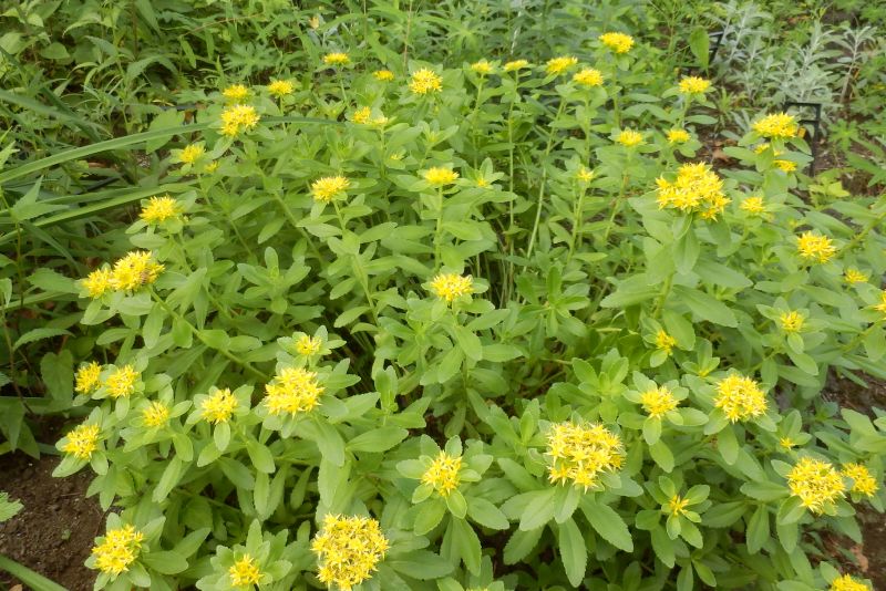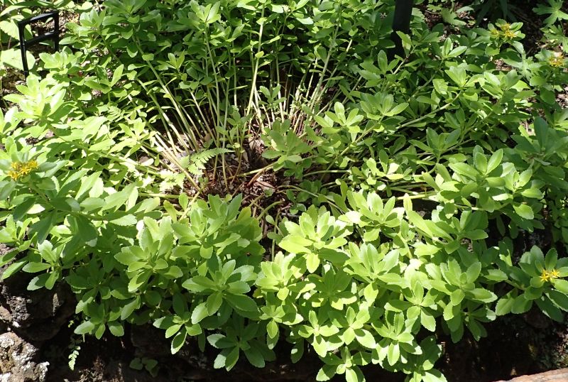 黄色くて小さい5弁花を多数円盤状に咲かせる。