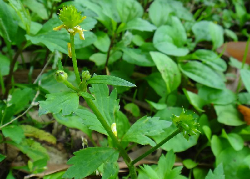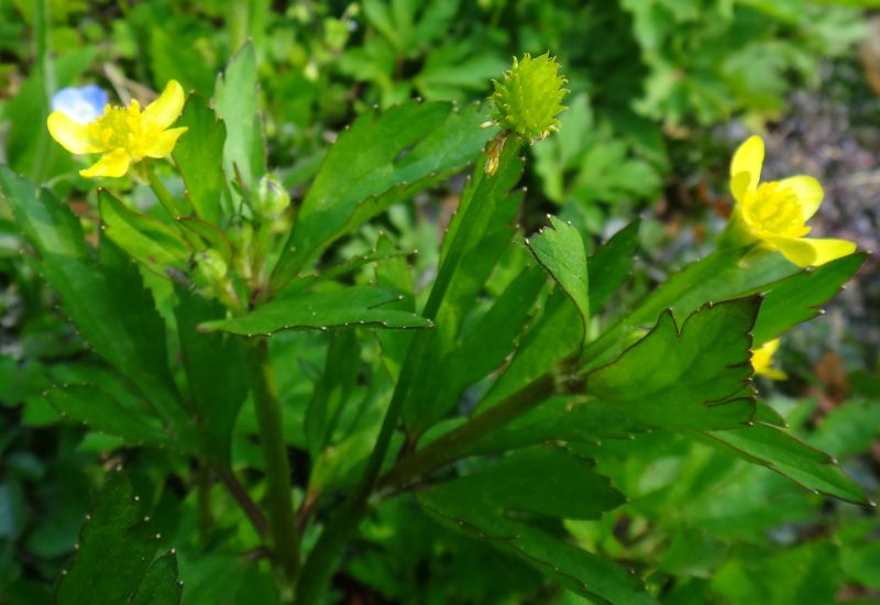 キツネノボタン :そう果の先が曲がり、茎は無毛で、小葉の切れこみが浅く、鋸歯はとがらない。