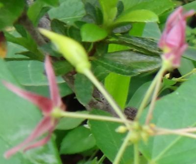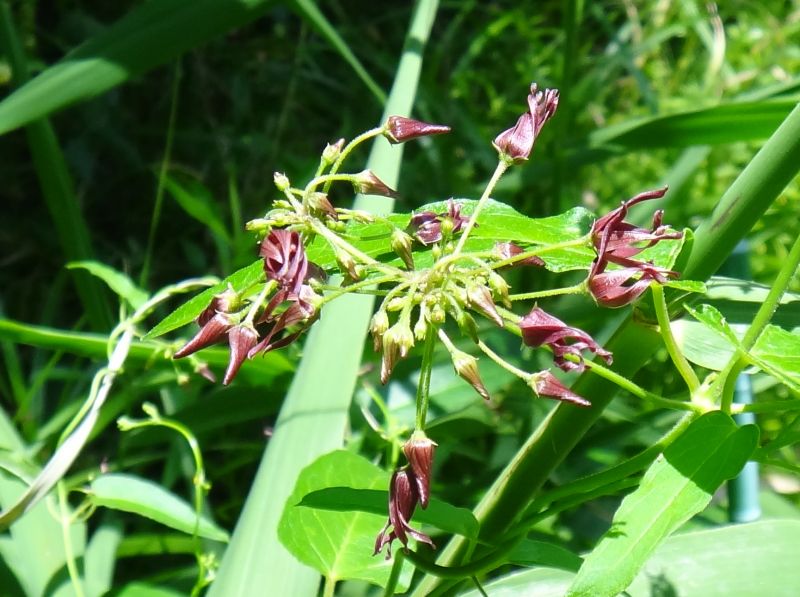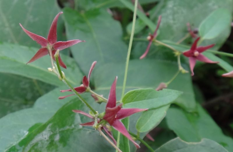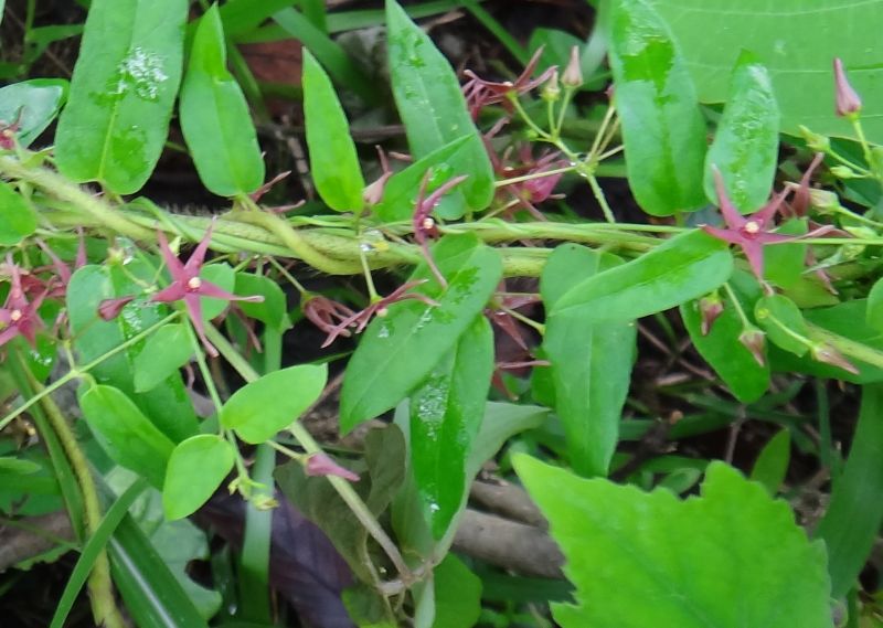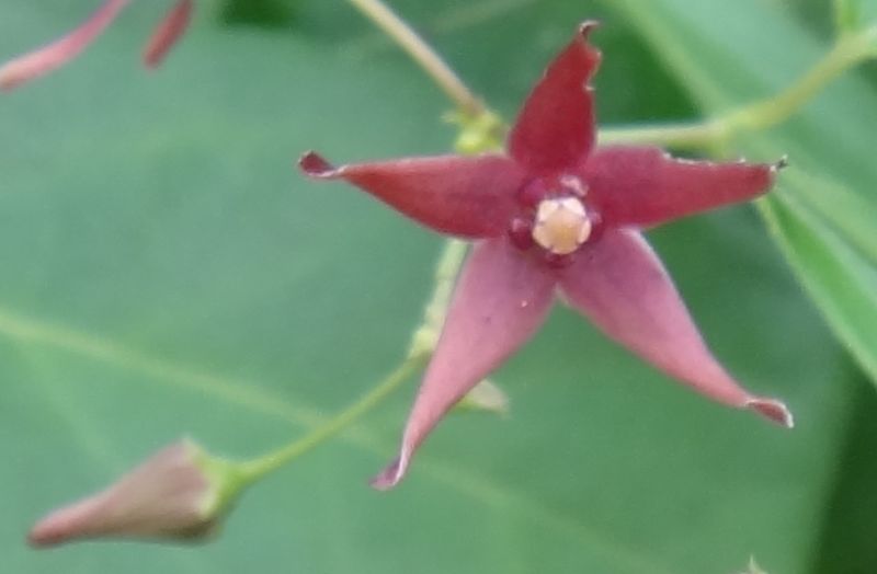 その先に直径約1センチで花冠が星形に5裂した暗紅紫色の花が咲く。