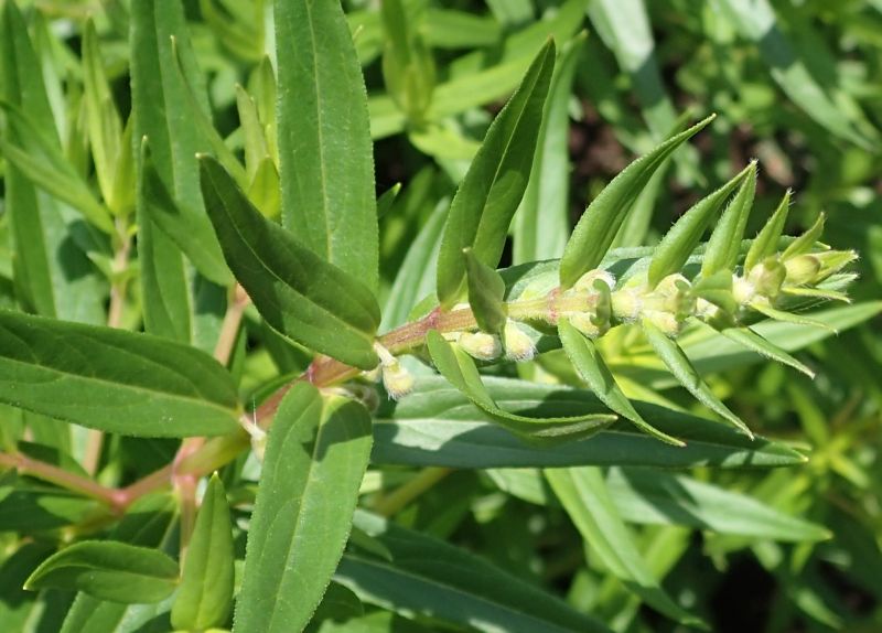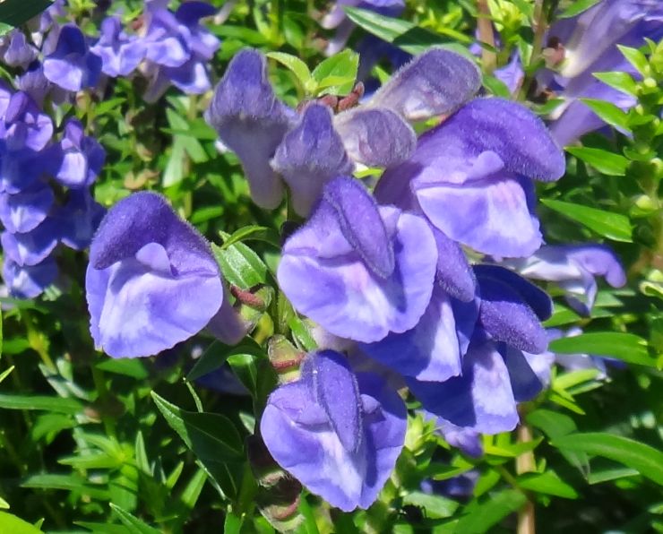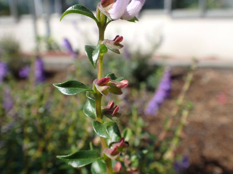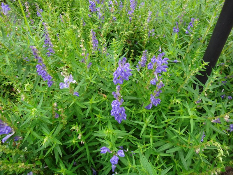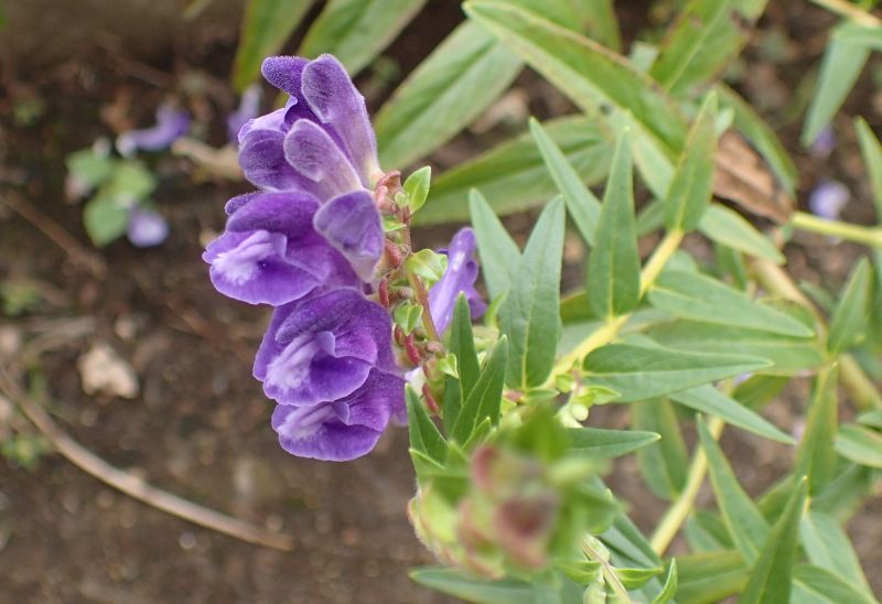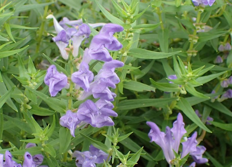 茎先の穂状花序に紫色の細長い唇形花をつける。