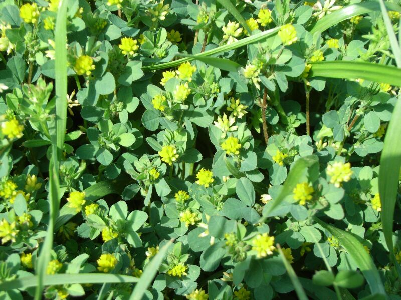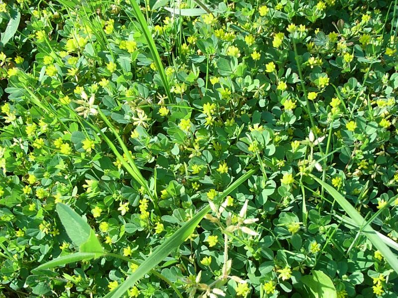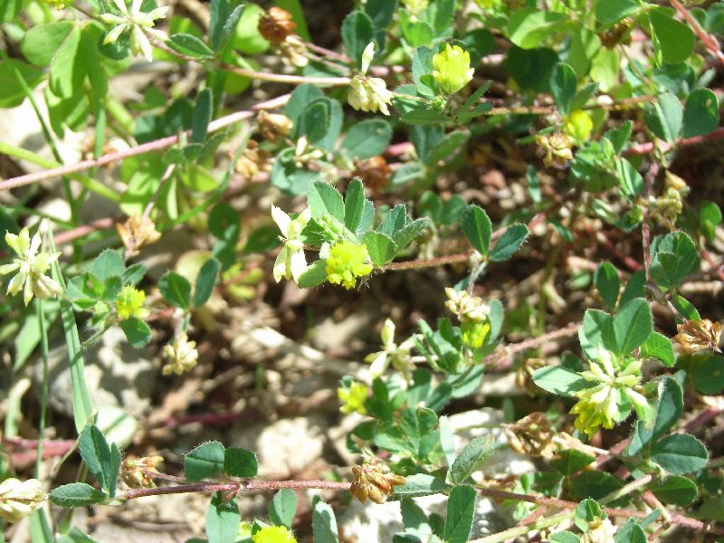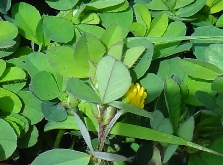 コメツブウマゴヤシ:20〜30個の花が球状に集まる、花柄が高くのびる、葉に白毛、先が半回転した豆果ができる。