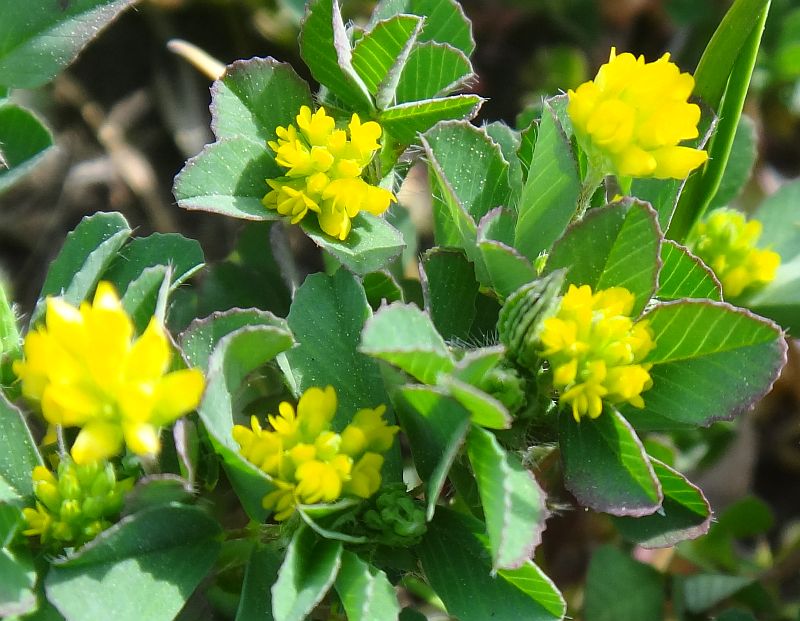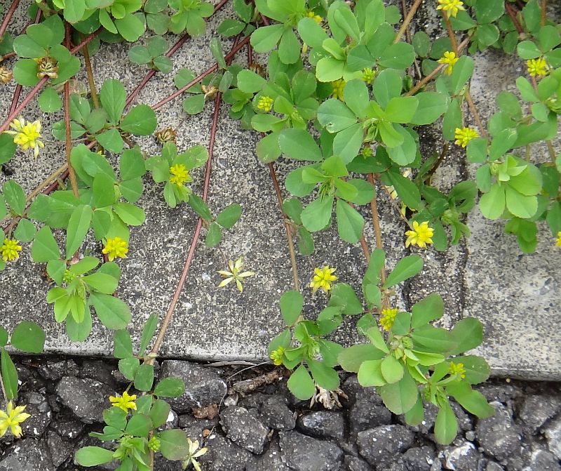 黄色で長さ3〜4ミリの蝶形花が5〜20個球状に密集する。