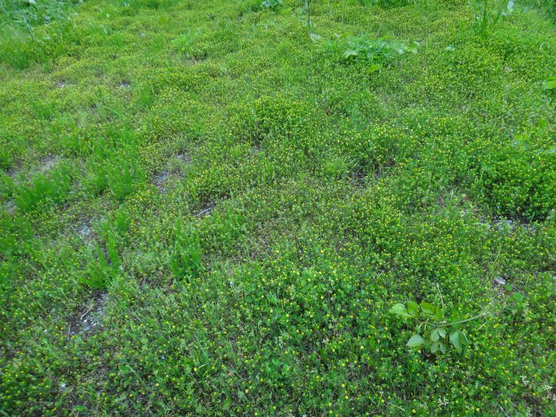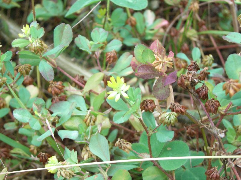 コメツブツメクサ :5〜20個の花が球状に集まる、花柄が短い、葉はほとんど無毛、受粉後下を向いた花の中に種子ができる。